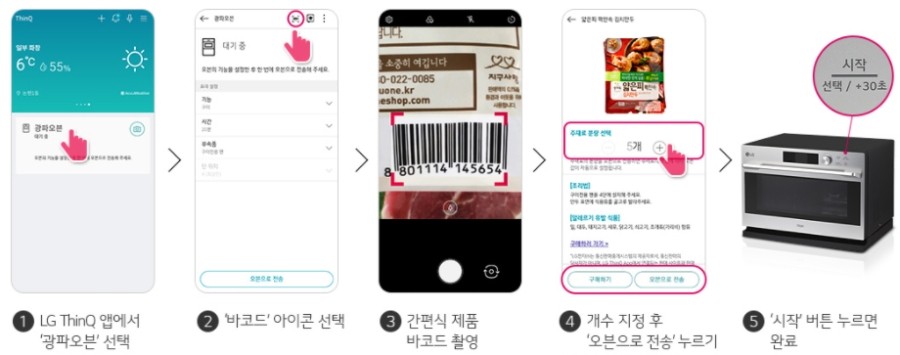 먼저 LG 광파오븐의 인공지능쿡은 스마트폰 카메라로 간편식 제품 바코드를 찍으면 제품의 조리 정보를 인식해서 조리모드와 시간을 자동으로 설정해 주는 기능인데, 모든 간편식에 적용되는 게 아니라 풀무원 간편식 39종에 불과해 다른 제조사 간편식에 대해서는 활용할 수가 없다. 사용방법 또한 아래와 같이 다소 복잡하여 필자라면 간편식 뒤에 쓰여있는 조리방식을 참고하여 기호에 따라 조리방식을 선택할 듯하다.