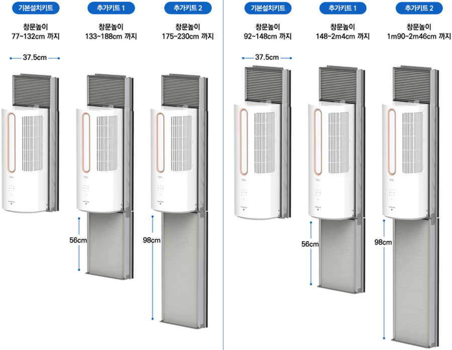 좌측이 파세코 창문형 에어컨 미니, 우측이 파세코 창문형 에어컨3의 설치 가이드이다. 앞서 언급한 대로 기본설치키트 사용 시 미니의 설치 가능 최소 창문 높이는 77cm로 파세코 창문형 에어컨3의 92cm보다 15cm 더 낮다. 이에 설치 가능 최대 창문 높이도 미니가 132cm로 16cm 더 낮다. 이 같은 설치 가능한 창문의 높이 차이는 추가키트 사용 시에도 발생하게 되는데 최소 창문 높이나 기본설치키트의 크기만 보고 잘못 키트를 선택하는 일이 없도록 주의가 필요할 듯하다.