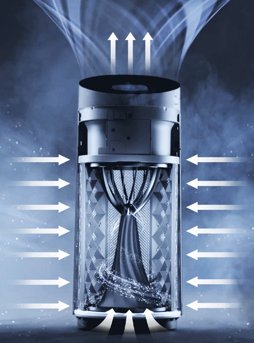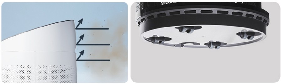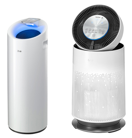 LG AS111WEW(좌), AS190DWFA(우) 위 이미지는 LG에서 출시한 공기청정기로 좌측은 2017년에 출시한 AS111WEW, 우측은 2019년에 출시한 AS190DWFA이다. AS111WEW의 경우 LG는 출시 당시에 넓은 면적의 토출구와 토네이도 터보팬을 통해 먼지는 많이 흡입하고 깨끗해진 공기는 더 멀리 보내준다고 내세웠고, AS190DWFA는 토출구가 올라와 깨끗한 공기를 더 멀리 더 빠르게 배출하는 클린 부스터와 NASA에서 개발한 항공팬 기술이 적용되어 더 넓어진 청정 면적으로 어디에 두어도 빈틈없이 청정바람을 보내준다고 내세웠다.