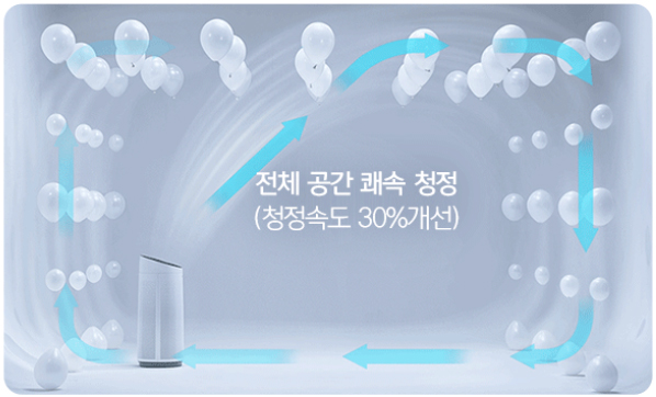 먼저 17도 경사면 송풍이다. 최적의 공기청정을 위한 각도로 17도를 제시하고 있으며, 이를 통해 수평으로 토출 되는 일반적인 공기청정기에 비해 청정 속도를 30% 개선했다고 설명하고 있다.