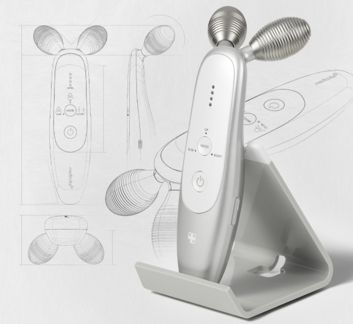 메디큐브 더마 EMS샷의 디자인도 주목할만한 부분이다. 피부에 닿게 되는 볼의 형태가 경락마사지의 각도를 갖고 있고, 가로결 패턴으로 같이 사용하게 되는 젤의 흡수를 돕는다.