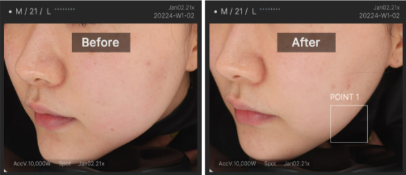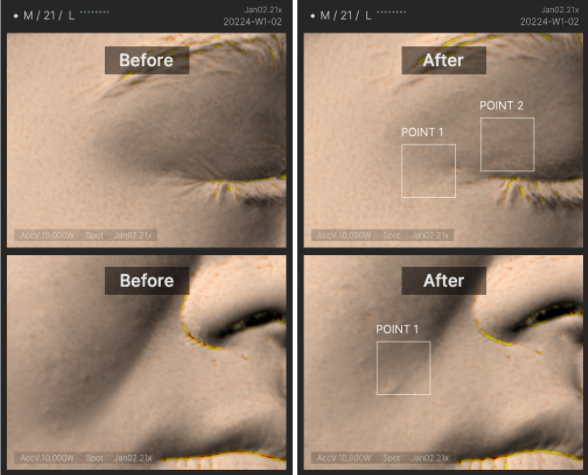 처진 눈꼬리 부위 겉탄력 18.3%, 속탄력 4.5% 개선, 처진 팔자 부위 겉탄력 10.7% 개선