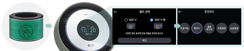 22년형 오브제 공기청정기는 21년형처럼 별도의 펫 전용 모델이 없다. 다만 구성품 필터가 다를 뿐이다. 22년형은 일반필터 모델을 구입하더라도 필터를 펫필터로 교체하고 UP가전 기능을 통해 펫 전용 모델에만 있던 펫모드를 사용할 수 있다. 물론 펫필터를 사용하는 것이 반려동물과 함께 하는 가정에서는 우선적으로 추천되나, 일반필터 모델로도 충분할 것 같다면 굳이 처음부터 펫필터 모델을 선택하지 않아도 되는 것이다.