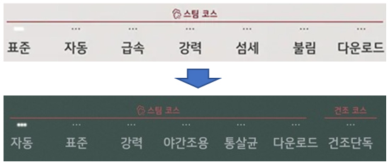 (위) 21년형, (아래) 22년형 기본 코스에도 변경 되었다. 21년형 모델의 세척코스 중 급속, 불림이 없어졌고, 섬세와 스팀 리프레시는 22년형 모델에서는 다운로드 코스로 이동했다. 반대로 22년형에는 앞서 언급한 건조단독코스가 생겼고, 야간조용 코스가 추가되었는데 야간조용 코스는 21년형에서 다운로드 코스에 속해 있던 코스이다. 전반적으로 사용빈도가 낮은 코스를 없애거나 다운로드 코스로 배치했는데, 급속이 없어진 게 조금 아쉽지만 불림은 강력코스로 대체할 수 있어 큰 문제는 없어 보인다.