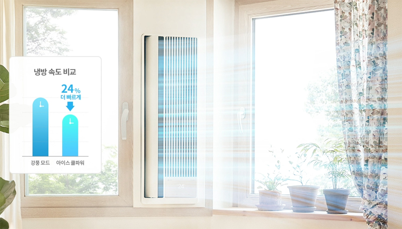 LG 창문형 에어컨은 듀얼 인버터 탑재로 에너지 1등급은 기본, 최저 소음은 파세코 창문형 에어컨4 PWA-3400W보다 조용한 34dB이며, 스탠드 에어컨에 있던 아이스 쿨파워 기능을 탑재하여 빠른 냉방이 필요할 때 강풍 모드 대비 24% 더 빠른 냉방도 가능하다. 참고로 제습기능도 있어 일일 제습량 34리터를 자랑한다.