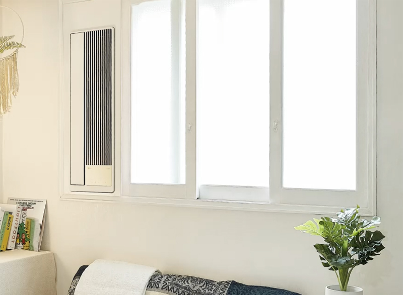 별도의 마감키트가 없는 경우 여타의 창문형 에어컨의 설치 형태처럼 상부 주름막나 에어컨 주변 창틀 등이 노출되지만 마감키트를 사용하게 되면 위와 같이 주름막이 보이지 않고 벽과 일체감을 주는 인테리어가 가능하다.