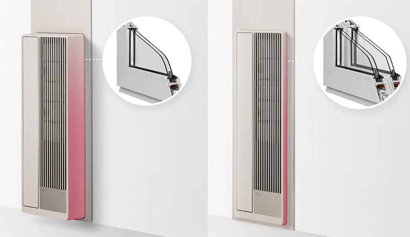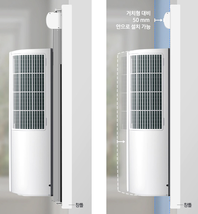 (좌) 단창/이중창 첫번째 창 설치, (우) 이중창 두번째 창 설치 또한 단창용 마감키트를 단창 또는 이중창 첫 번째 창에 설치하면 에어컨 본체가 150mm 정도만 돌출되고, 이중창용 마감키트를 이중창 두 번째 창에 설치하면 24mm 정도만 돌출되어 기존에 없던 수준의 깔끔한 설치가 가능하다.