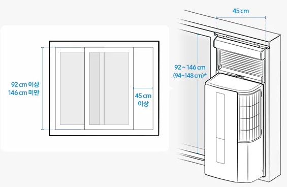 삼성 윈도우핏의 설치가능 창문크기 참고로 삼성 윈도우핏의 본체 높이가 LG 창문형 에어컨보다 낮다 보니 설치가능 최소 창문 높이도 92cm로 LG의 110cm 보다 더 낮다. 반면에 LG 창호형 에어컨의 가로가 삼성 윈도우핏 보다 작다보니 설치가능 최소 창문 열림폭은 40cm로 삼성의 45cm보다 더 작다. 정리하자면 창문 높이가 낮아서 걱정이 된다면 삼성 윈도우핏이 상대적으로 유리, 창문 폭이 좁아 걱정이 된다면 LG 창문형 에어컨이 보다 유리하다고 볼 수 있다.