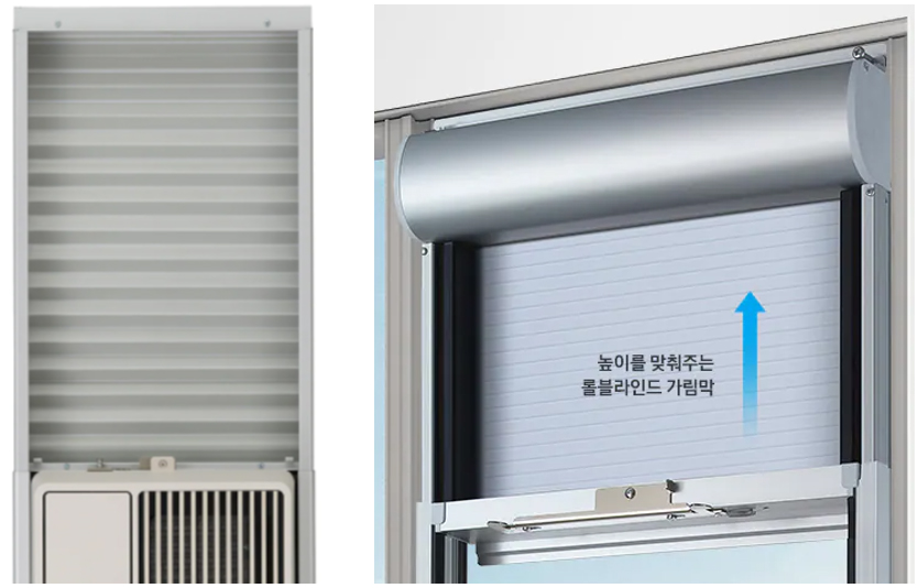 (좌) LG 창문형 에어컨의 주름막, (우) 삼성 윈도우핏의 롤블라인드 또한 높이를 맞춰주는 가림막 형태도 삼성 윈도우핏의 롤블라인드 형태가 LG 창호형 에어컨의 주름막과 비교해 보다 견고하고 고급스럽다.