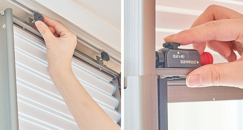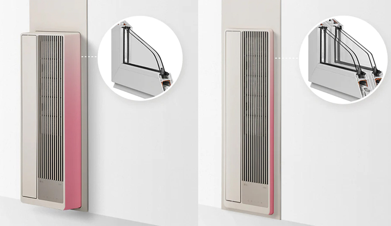 (좌) 단창/이중창 첫번째 창 설치, (우) 이중창 두번째 창 설치 또한 단창용 마감키트를 단창 또는 이중창 첫 번째 창에 설치하면 에어컨 본체가 150mm 정도만 돌출되고, 이중창용 마감키트를 이중창 두 번째 창에 설치하면 24mm 정도만 돌출되어 앞툭튀가 최소화된 설치가 가능하다.