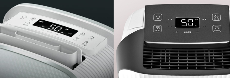 (좌) 인버터 19리터 DXJE193-LMK, (우) 정속형 17리터 DN3E170-LWK 토출구 디자인은 취향에 따라 갈릴 수 있겠다. 17리터 모델인 DN3E170-LWK는 슬라이드형 토출 그릴로 평소에는 토출구가 디스플레이로 덮여있다가 제습시에는 슬라이딩으로 토출구가 열리는 방식이고, 19리터 인버터 모델인 DXJE193-LMK는 디스플레이는 고정이고 제습시에는 평소에 막혀있던 토출구가 안쪽으로 들어가면서 토출구가 올라오는 구조를 갖는다.