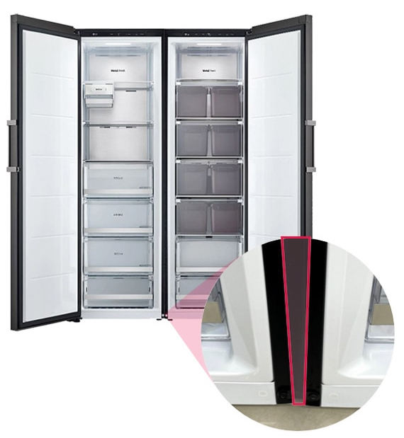 냉동실디스플레이 외부LED 내부LED 에너지등급 3등급 3등급 월간소비전력 26.5Wh 25.5kWh 페어설치키트 불가 가능 크기(WxHxD) 595x1860x677mm 595x1860x676mm