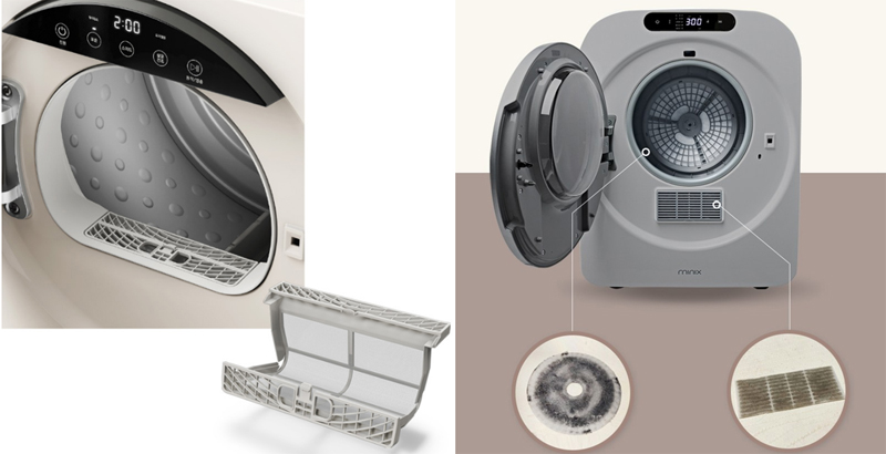 (좌) 위닉스 컴팩트 건조기 필터, (우) 미닉스 미니 건조기 필터 위닉스 컴팩트 건조기는 일반적인 건조기처럼 반영구적으로 사용할 수 있는 포켓형 필터가 탑재되어 있고, 미닉스 미니 건조기는 소모성인 흡기필터와 배기필터가 사용된다. 아무래도 배기필터와 흡기필터를 각각 사용하는 미닉스 건조기가 필터의 성능이 더 나을 것으로 예상되나, 필터를 물로 씻어 반영구적으로 사용할 수 있는 위닉스 컴팩트 건조기가 1년에 12,000원의 필터 교체 비용이 발생하는 미닉스 미니건조기에 비해 유지비용에 있어서는 우위에 있다고 볼 수 있다.