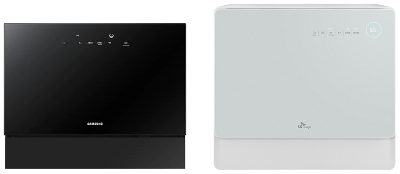 (좌) 삼성 비스포크 카운터탑, (우) SK매직 식기세척기 카운터탑 삼성 비스포크 카운터탑은 바스켓이 1단으로 되어 있는 반면에 SK매직 식기세척기 카운터탑은 바스켓이 기본적으로 2단으로 되어 있고 필요에 따라 상단 바스켓을 분리해 1단으로 사용할 수 있어 식기에 따라 바스켓의 구성을 달리할 수 있어 훨씬 효율적인 식기의 적재 및 세척이 가능하다.