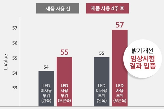 그럼에도 불구하고 면도시 근적외선 LED가 확실하게 작동을 하고 이를 반복적으로 사용함으로써 피부 밝기 개선 효과가 있음이 입증됐다. 성인 남자 33명을 대상으로 한 임상시험에서 주 5회, 4주간 사용 후 LED 미사용 부위 대비 피부 밝기 개선 변화율 최대 6배 증가라는 결과를 보인 것이다.