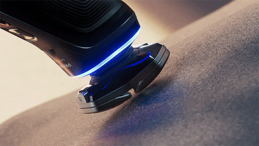 SkinIQ의 핵심인 압력 컨트롤 센서는 오직 SkinIQ 9000 시리즈에만 탑재되어 있다. 헤드에는 라이트링이 장착되어 있어 센서를 통해 약한 압력이 들어오면 블루 색상으로 면도 성능 저하를 알려주며, 완벽한 압력이 들어오면 그린 색상으로 이를 알려주어 최상의 밀착면도를 할 수 있으며, 강한 압력이 들어오면 레드 색상으로 알려주어 피부 상처를 방지할 수 있다.