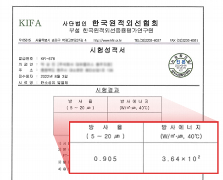 원적외선의 정확한 방사율이 얼마인지 전혀 공개하지 않고 있는 여타의 카본매트와 다르게 위니아 카본매트는 90.5%의 정확한 수치를 공개하고 있다. 방사율이 공개된 카본매트의 원적외선 방출량이 85~90% 범위인 것을 감안하면 위니아 카본매트는 상원적외선 방출량에서 우위를 점하고 있다고 볼 수 있다.