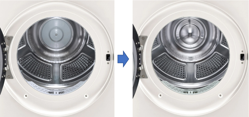 (좌) 22년형 LG 워시타워 20kg 건조기, (우) 23년형 LG 워시타워 21kg 건조기 LG 워시타워 세탁 용량 25kg 모델은 22년형이든 23년형이든 하부 세탁기는 동일한 스펙을 갖기 때문에 상부 건조기에 주목할 필요가 있다. LG 워시타워 건조기 20kg 모델은 드럼의 옆면만 스테인리스이나, LG 워시타워 건조기 21kg 모델은 드럼의 옆면뿐만 아니라 뒷면도 스테인리스 재질로 변경되어 드럼의 내구성 향상은 물론 위생적인 부분에 있어서도 업그레이드 되었다.