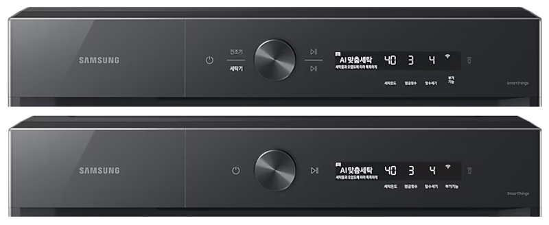 (좌) 22년형 강화유리+크롬데코, (우) 23년형 강화유리 그런데 23년형 삼성 그랑데 건조기는 위와 같이 상단 조작부의 색상이 본체 색상과 통일되면서 도어 테두리의 크롬데코도 같이 없어졌는데 이를 통해 건조기의 컬러가 본체 색상과 도어의 블랙 색상으로만 나눠짐으로써 전체적인 색상의 통일성이 좋아졌다.