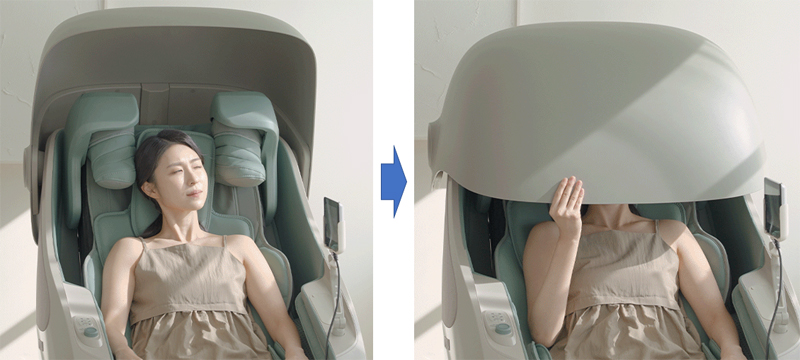 코지마 안마의자 호프에는 머리 양쪽에 블루투스 스피커가 내장되어 있어 음악을 감상하며 마사지를 즐길 수 있다. 사실 여기까지는 여타의 블루투스 스피커가 장착된 안마의자와 차별점이 없는데, 결정적인 차이는 얼굴을 가릴 수 있는 후드가 있다는 점이다.