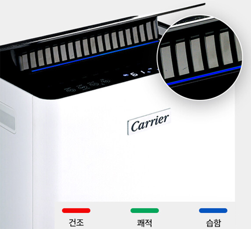 제습기 상부에 기본적으로 현재 습도가 표시되나 추가적으로 LED 인디케이터가 탑재되어 현재의 습도 상태를 멀리서도 색상으로 확인할 수 있다. 참고로 인디케이터는 현재 습도가 건강습도인 40%에서 65% 사이면 초록색(쾌적), 65% 이상이면 파란색(습함), 40% 미만이면 붉은색(건조)으로 표시가 된다.