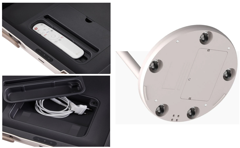 (좌) 스탠바이미 고의 수납함, (우) 스탠바이미의 무빙휠 때문에 리모컨, 전원 케이블도 편리하게 가지고 다닐 수 있도록 캐리백 내에 수납 공간이 마련되어 있으며, 손으로 들고 다니는 가방 형태이기 때문에 스탠드 형태의 스탠바이미에 달려있는 무빙휠은 적용되어 있지 않다.