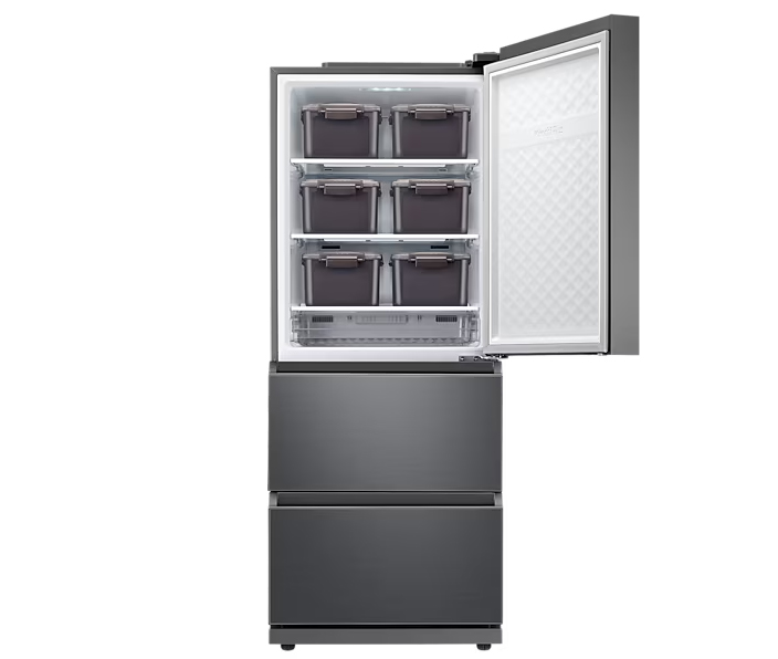 328리터 용량의 RQ33C71G1S9 삼성 김치냉장고 RQ33C71G1S9는 비스포크 키친핏 모델인 RQ33C7411AP, RQ33C74B1AP와 같은 3도어이나 내부 용량은 328리터로 다른 두 모델에 비해 15리터 더 크다. 칸별 용량을 살펴보면 상칸은 10리터 더 큰 173리터, 중칸과 하칸은 각각 2리터 더 큰 90리터, 65리터이다. 제공되는 김치통 개수와 용량은 동일한 가운데 상칸의 공간이 더 여유가 있는만큼 미세한 차이지만 냉기순환에 보다 유리하다고 볼 수 있다.