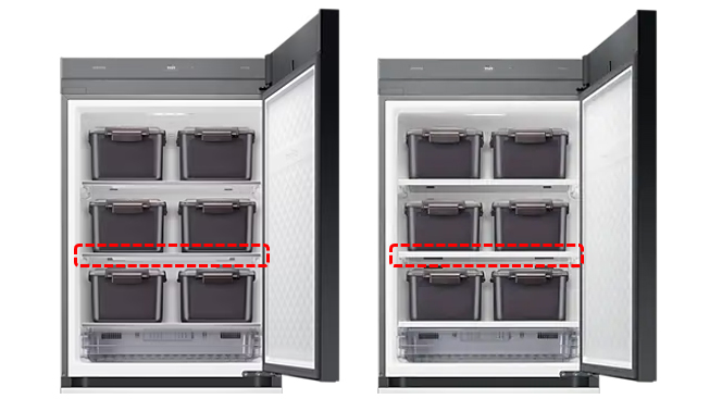 (좌) 메탈데코 선반, (우) 일반 선반 비스포크 김치냉장고 RQ33C7411AP와 RQ33C74B1AP의 차이는 선반 종류이다. RQ33C7411AP는 선반 테두리가 메탈로 되어 있는 반면에 RQ33C74B1AP는 플라스틱으로 되어있다. 도어를 열었을때 메탈데코 선반이 주는 고급감이 생각보다 크기 때문에 김치냉장고 외형의 고급스러움은 물론 내부의 고급스러움까지 원한다면 메탈데코 선반이 적용되어 있는 RQ33C7411AP를 추천한다.