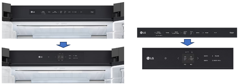 LG 얼음정수기 냉장고 22년형의 디스플레이는 1열에 가깝게 가로로 길게 구성된 반면에 23년형은 가로 길이가 줄고 세로가 늘어나면서 2열처럼 배치된 것이 특징이다. 1열보다는 2열이 조작부가 중앙으로 모여 있어 상대적으로 편리할 수 있겠으나, 보통 냉장고의 디스플레이는 확인 빈도나 조작 빈도가 낮은 편이고, 상단 냉장실 내부에 위치한 만큼 평소에 보이지도 않기 때문에 23년형만을 고집할 필요는 없다.