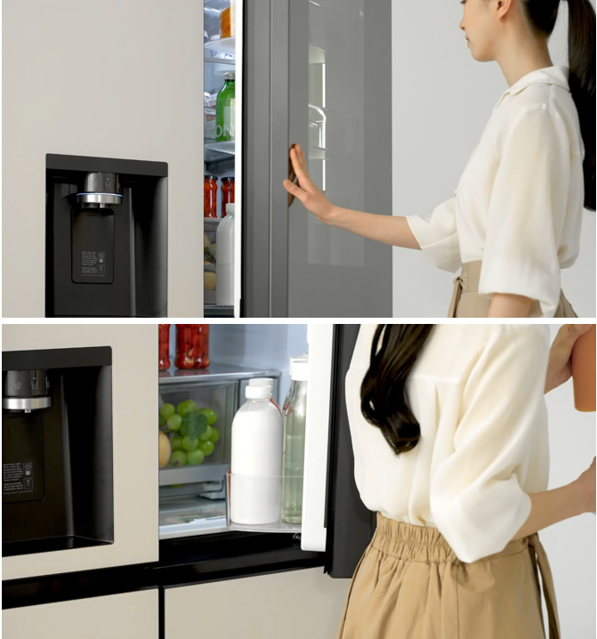 LG 얼음정수기 냉장고 23년형에는 오토 클로징 기능이 탑재되어 도어를 손으로 끝까지 밀지 않더라도 혹은 팔꿈치로 살짝 밀어도 일정 각도까지만 밀면 도어가 알아서 부드럽게 끝까지 닫힌다. 이를 통해 도어를 실수로 열어두는 상황을 방지해 주고, 닫힐 때도 마지막에 부드럽게 닫히기 때문에 도어부의 충격과 소음도 줄여준다.