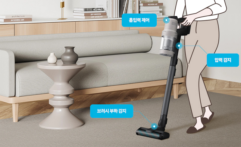 23년형 삼성 청소기는 AI모드가 탑재되어 브러시 부하와 압력을 감지하여 카펫 위에서는 알아서 흡입력을 높여 숨어있는 먼지를 흡입하고, 매트에서는 흡입력을 낮춰 매트를 들러붙지 않게 하면서 먼지를 흡입하며, 마루에서는 강력한 흡입력을 유지하면서도 최적의 알고리즘으로 흡입력을 제어해 배터리를 절약해 준다.