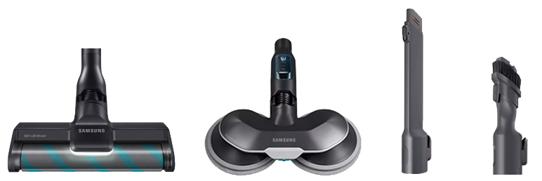 좌측부터 침구 브러시, 펫브러시 플러스, 플렉스 연장관 침구 청소에 최적화된 침구 브러시, 털을 모으는 V자 구조 및 엉킴 제거 그라인더가 탑재된 펫브러시 플러스, 청소기 헤드가 잘 닿지 않는 곳을 커버해 줄 수 있는 플렉스 연장관은 추가 브러시 및 추가 액세서리로 이 구성에 따라 모델이 달라진다.
