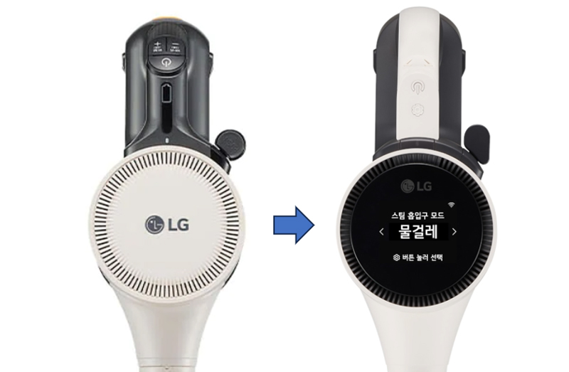LG 오브제 청소기 22년형은 LED 표시창으로 배터리 상태나 이물질 막힘 정도만 간단하게 표시가 되었던 반면에 23년형은 2.3인치의 시원한 LCD 알림창으로 청소모드, 사용 가능 시간, 먼지 비움 상태, 배터리 충전 상태 등을 선택하고 확인할 수 있게 되어 보다 편리한 사용이 가능해졌다.