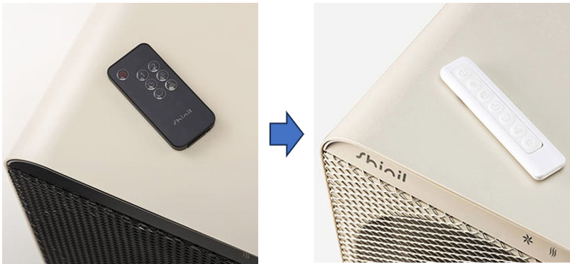 (좌) 22년형, (우) 23년형 색상 종류 자체도 23년형이 더 많지만 색상이 변경되는 부분도 22년형은 측면만 바뀌나(전면은 블랙 고정), 23년형은 전면부도 색상이 바뀌기 때문에 색상 선택의 의미가 훨씬 크다. 또한 히터 중앙의 가드링도 23년형에는 22년형에 있던 영문 신일 로고가 사라지고 대신에 세련된 빗살무늬가 들어가 색상과 디자인 모두 업그레이드 되었다고 볼 수 있다.