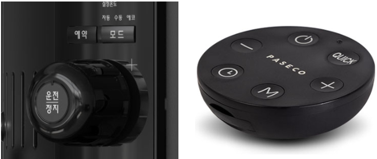 캠프8000의 (좌) 디지털 방식 제어, (우) 마그네틱 리모컨 파세코 캠프8000은 앞서 언급했듯이 불멍이 불가능하고, 리프트 높이조절도 불가능하지만 디지털 제어 방식이 적용되어 디스플레이 조작부를 통해 12~30도 사이로 온도를 설정할 수 있고, 1~9시간 사이로 꺼짐이나 켜짐 예약이 가능하다. 뿐만아니라 보다 강력한 화력과 다양한 편의기능을 가졌음에도 불구하고 난로의 크기는 캠프30, 29, 27과 비교해 보다 컴팩트하다.