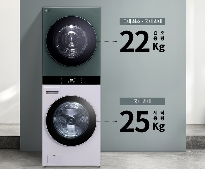 LG 워시타워 WL21EGZU, WL22EGZU의 세탁 용량은 25kg로 동일하나, 건조 용량은 WL21EGZU가 21kg, WL22EGZU는 22kg로 1kg 늘어났다. 이는 24년 현재 기준 워시타워 중 가장 큰 용량으로 당분간 더 큰 용량의 워시타워는 출시되지 않을 것으로 예상된다.
