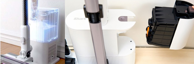 샤크 무선청소기 중 IQ가 아닌 IQ+ 시리즈인 IW3241KR, CS851 AED(CS851KRMVAE)는 거치대에 청소기의 먼지통을 자동으로 비워주는 스테이션이 장착되어 있어 청소기의 먼지통을 손으로 비워줄 필요가 없기 때문에 그만큼 손이 더러워지거나 비움시 실내에 먼지를 날릴 일이 없다.
