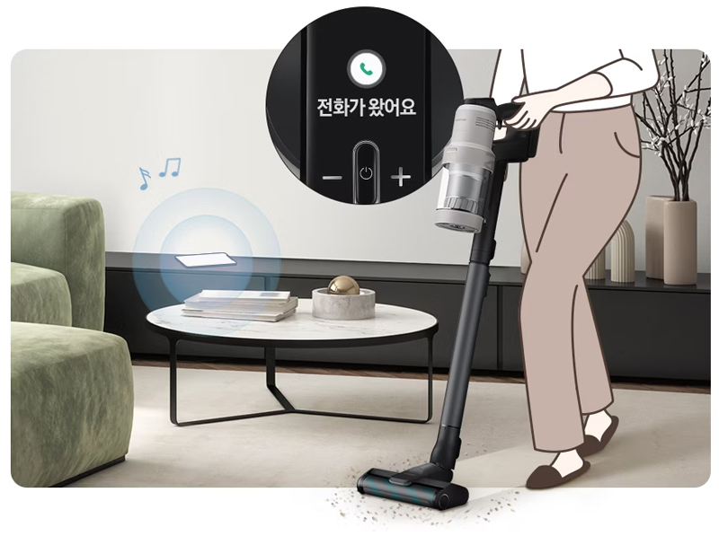 청소시 시끄러운 소음 때문에 중요한 전화나 문자를 바로 받지 못하거나 확인을 못하는 경우가 있을 수 있는데, 삼성 청소기 24년형은 핸드폰 수신 알림 기능이 있어 설정을 통해 핸드폰에 전화나 메시지가 오면 청소를 멈추고 알림이 오도록 할 수 있다. 다만 지원되는 기기는 안드로이드11, One UI 3.1 이상의 삼성 스마트폰으로 삼성 일부 저가형 스마트폰(A1x, A2x, M1x, M2x 시리즈)와 타사 스마트폰에서는 사용할 수 없어 이 부분은 다소 아쉽다.