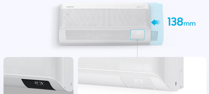 그러나 벽걸이 에어컨은 확실히 무풍에어컨 슬림이 보다 컴팩트하다. 높이와 깊이는 299mm, 215mm로 동일한데 가로가 무려 138mm나 작아 전체 부피도 17% 더 슬림하다. 참고로 디스플레이도 기존 블랙 디스플레이에서 화이트 디스플레이로 바뀌어 보다 깔끔해졌다.