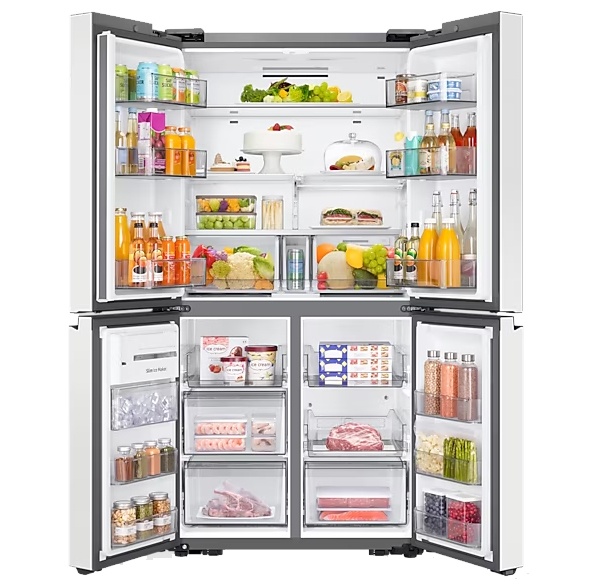 4도어 냉장고 RF84C906B4W 4도어 냉장고인 RF84C906B4W는 긴채소를 자르거나 접지 않고 그대로 보관할 수 있는 긴채소 보관실, 높이가 있는 솥 등을 넣을 수 있도록 선반을 접어 공간을 확보할 수 있는 접이 선반이 탑재되어 있으며, 볼록했던 냉장실 후면을 플랫하게 디자인하여 수납공간을 극대화한 플랫 커버도 적용되어 있다. 이는 양문형 냉장고인 RS84B5041CW에는 없는 것으로 더 큰 냉장실, 더 편리한 식자재 보관을 중시한다면 RF84C906B4W를 추천하는 이유이다.