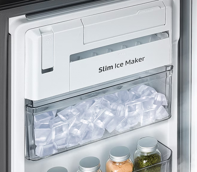 RF84C906B4W의 슬림 아이스메이커 얼음을 만들 수 있는 아이스메이커도 RF84C906B4W는 슬림 아이스메이커가 냉동실 좌측 도어 내부에 탑재되어 있어 급수통에 물을 부어 간편하게 얼음을 만들고 레버를 당겨 하부 저장통으로 얼음을 편리하게 보관할 수 있으나, RS84B5041CW는 기존의 단순한 얼음틀인 트레이 방식으로 슬림 아이스메이커와 비교해 급수 및 보관이 불편하다.