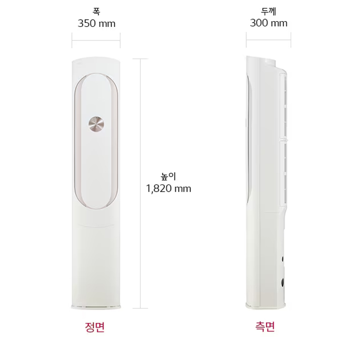 클린 케이스셀프청정관리 X O 무드라이팅 X O 크기(WxHxDmm) 350x1820x300 380x1915x295 바로가기 보러가기 보러가기 * 인공지능듀얼인버터, 아이스쿨파워, 스마트케어, 희망온도0.5도미세조절, 펫케어모드, 롱숙면모드, 절전냉방, 제습운전은 공통 사양