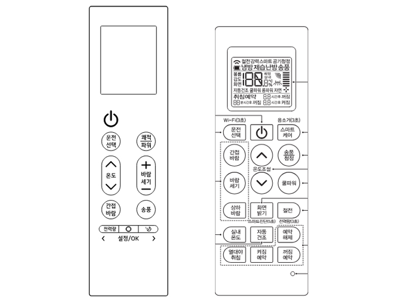 (좌) 신형 라이트 리모컨, (우) 구형 일반 리모컨 리모컨도 24년형 SQ06EA1WCS는 신형 라이트 리모컨, 23년형 SQ06BDAWBS는 구형 일반 리모컨으로 신형 라이트 리모컨은 자주 사용하는 기능을 심플하게 선택할 수 있도록 디자인되었고, 버튼에 불빛이 들어와 어두운 밤에도 편리하게 리모컨을 조작할 수 있다. 구형 일반 리모컨은 버튼이 많아 다소 복잡해 보이나 자주 사용하지 않는 기능이더라도 한 번에 버튼을 누를 수 있다는 장점을 갖는다.