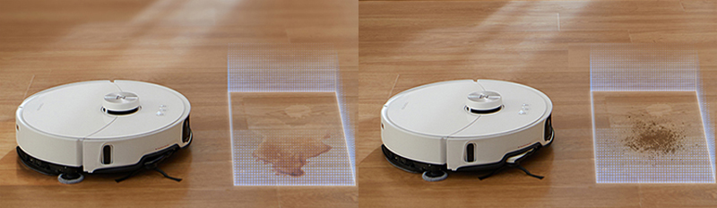(좌) 습식 오염, (우) 건식 오염 또한 로보락 S8 MaxV Ultra는 RGB 카메라를 통해서 바닥의 오염을 감지할 수 있게 되었는데, 액체 등의 습식 오염을 인식하면 흡입을 중지하고 메인 브러시를 리프팅하며, 물걸레의 출수량을 줄여 젖은 액체를 걸레로 흡수한다. 또한 먼지(건식 오염)를 인식하면 흡입력과 사이드 브러시의 회전속도를 높여 보다 확실한 청소를 할 수 있다.