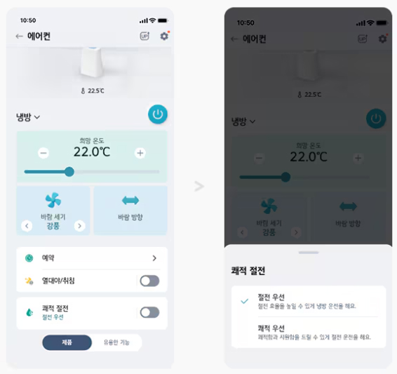 2단계 절전모드 23년형 LG 이동식 에어컨 PQ08DDWAS1의 절전모드는 단일 절전모드이나 24년형 PQ08EDWAS의 절전모드는 절전우선과 쾌적우선의 2개로 필요에 따라 절전모드를 선택할 수 있다. 절전우선 모드시에서는 절전 효율을 중시하기 때문에 소비전력을 많이 낮출 수 있는 대신에 냉방이 약할 수 있는데, 쾌적우선 모드시에는 절전 효율을 어느 정도 챙기면서도 쾌적한 냉방이 가능하다.