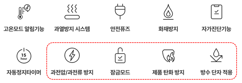 10종 안전장치 참고로 안전장치 종류에 있어서도 EME520, EME550S는 10종, EME500은 6종으로 과전압/과전류 방지, 잠금모드, 제품 탄화 방지, 방수 단자 적용이 제외되어 있다. 물론 과전압/과전류 방지나 제품 탄화 방지가 없더라도 경동나비엔 카본매트는 기본적으로 과열방지, 안전퓨즈, 화재방지 관련 안전장치가 있기 때문에 EME500이 안전성이 부족한 제품이라고 볼 수는 없다.