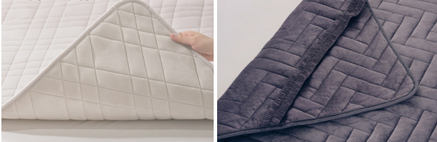 (좌) 스웨이드, (우) 고정밴드 경동나비엔 카본매트 EME520, EME550S, EME500는 침대에서의 매트 밀림을 방지하기 위한 장치들이 마련되어 있다. EME520, EME500은 매트 밑면에 스웨이드가 적용되어 침대와의 밀착력을 높여 미끄럼을 방지하고, EME550S는 침대와의 고정을 위한 밴드로 미끄럼을 방지하는데, 잠자는 동안 뒤척임이 심하다면 스웨이드만으로는 한계가 있기 때문에 고정밴드가 적용되어 있는 EME550S를 추천한다.