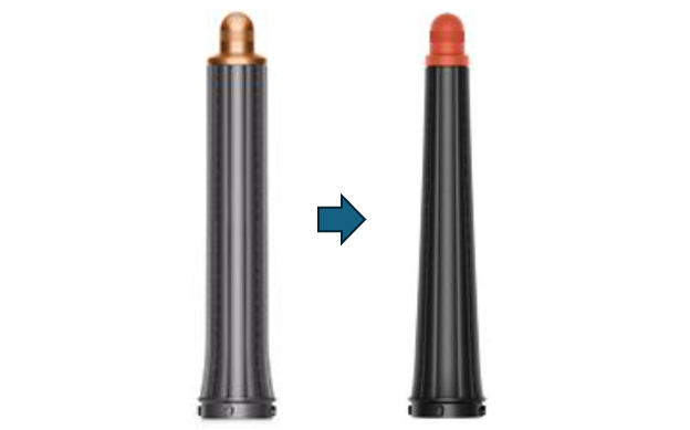 (좌) 30mm 배럴, (우) 콘 배럴 다이슨 에어랩 컴플리트 롱의 30mm 배럴이 다이슨 에어랩 id에서는 콘 배럴로 바뀌었다. 콘 배럴은 옥수수처럼 위쪽으로 갈수록 좁아지는 형태로 이를 통해 머리 뿌리 끝까지 더 선명한 컬을 만들 수 있다. 따라서 컬이 쉽게 풀려 고민이라면 다이슨 에어랩 컴플리트보다는 다이슨 에어랩 id를 추천한다.