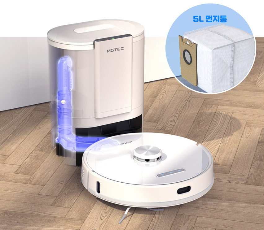 엠지텍 트윈보스S9 PRO MASTER의 자동먼지처리기 트윈보스S9 프로 마스터의 먼지처리기의 용량은 5리터로 오즈모 T9에 비해 2배가 크며, 그럼에도 불구하고 자동먼지처리기의 크기는 오즈모 T9의 300x420x430mm보다 작은 282x361x202mm이다.
