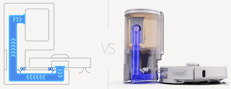 이뿐만이 아니다. 트윈보스S9 프로 마스터의 경우 먼지통이 로봇청소기 뒷부분에 위치하고 있어 짧은 먼지통로와 1개의 90도 구간으로 강력한 흡입이 가능하다. 물론 근본적으로 먼지처리기의 흡입력이 관건이겠지만 흡입력이 비슷하다는 전제하에 트윈보스S9의 자동먼지처리기가 구조적으로 더 우위에 있다.